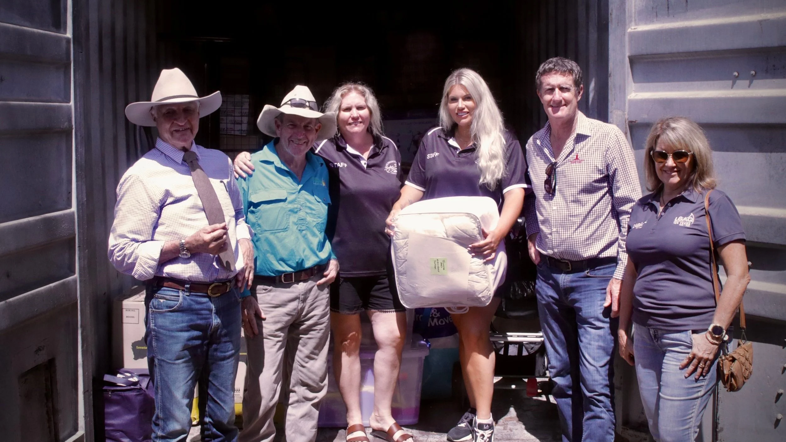 MP Bob Katter, Andrew Bamberick from Rural Pumping Solutions, Loretta Mahoney, Samantha Mahoney, Mayor Frank Beveridge, and Cr Kate Hastie with the Gulf Donations container in Charters Towers